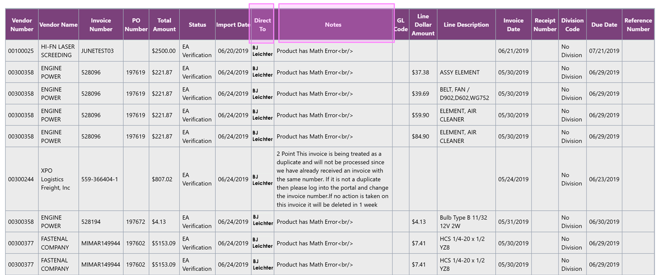 Now we can see which invoices are still moving through the workflow. In the Notes column, you’ll see details about the current status or hold reason—especially useful for identifying problem PO invoices that may require follow-up. The Direct To column indicates which user or queue currently has the invoice, helping you pinpoint where it’s sitting in the approval process.