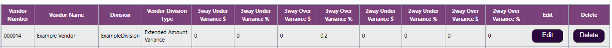 - The new rule will be stored and displayed as an entry in the Vendor Division Tolerance list.