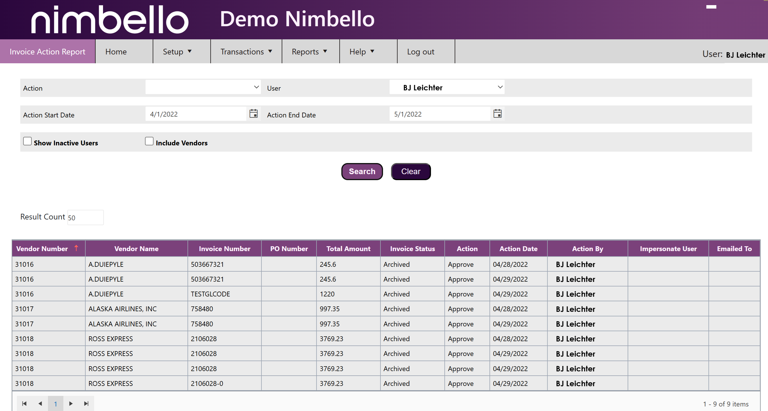 Monitor User Involvement | Search by user to see every invoice they've interacted with and what actions were taken. |