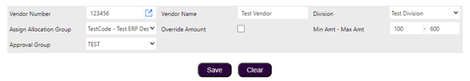 Navigate to the Vendor Division Approval page (Setup > Client Info > Vendor Division Approval). In this page, select a Vendor. Then select the Division and Approval Group you would always want to be assigned to the vendor. Then select the Allocation Group you would want to apply to invoices for this vendor (see this article to learn how to set up Allocation Codes):