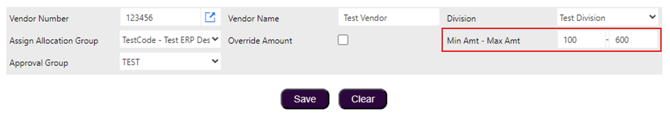 You can then set a Min Amt and Max Amt. These are the minimum and maximum invoice amounts that can be auto-approved. In the below example, any invoice under $100.00 for this vendor will not be auto-coded and auto-approved, and any invoice over $600.00 for this vendor will not be auto-coded and auto-approved: