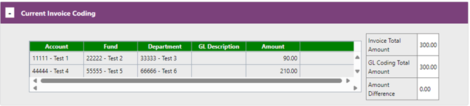 With the “Vendor Division Auto Approval” item I set up in the previous step, an invoice for vendor # 123456, with an amount of $300.00, will auto-code to the following: