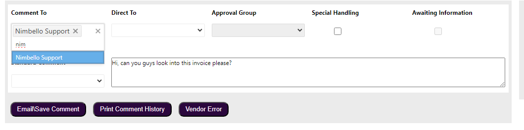 - Select Nimbello Support: In the Comment-to dropdown, choose Nimbello Support as the recipient.